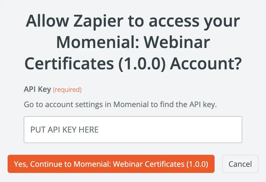 Please keep the key a secret because it allows external apps (e.g. Zapier) to make changes (e.g. create certificates) in your Momenial account. At any time, click Delete to delete the key and stop the integration.