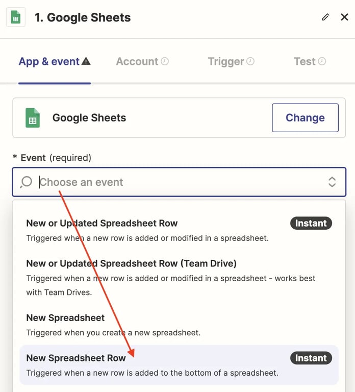 A panel will appear on the right-hand side. In the Event field, choose New Spreadsheet Row and click Continue.
